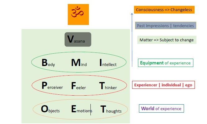 Each Individual(PFT), due to ignorance and vasanas, is seeking Permanent Happiness amidst the temporary objects, emotions & thoughts (OET) through the Body, Mind and intellect using their equipment (BMI). Hence, one feels empty despite all achievements.